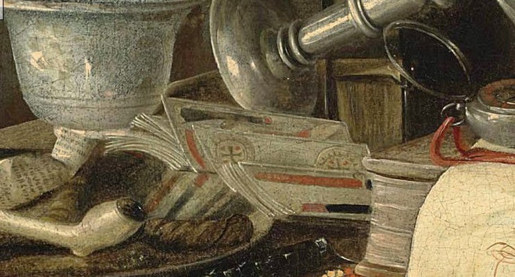 This particular painting, attributed to Flanders-based French artist Sebastien Bonnecroy, features the usuals suspects – a hollow-eyed skull (to remind us of our mortality) surrounded by temporary things – the cupboard decorated by a skeleton holding an hour glass, the candle that burns down, the pipe that breaks, the clock that ticks out the hours of our lives (I actually typed ‘cock’), and a whole load of other symbols that trumpet the painting’s purpose: YOU ARE GOING TO DIE.